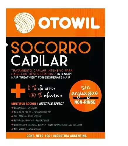 Otowil Socorro Capilar Tratamiento Intensivo múltiple acción, desenreda, realza el color, voluminiza, repara las puntas, da brillo y suavidad intensa.